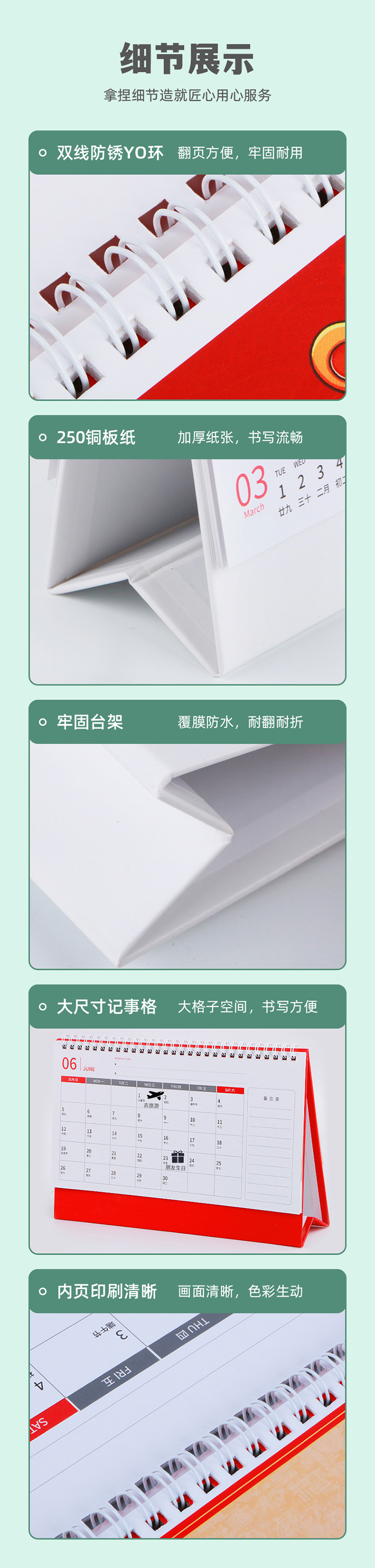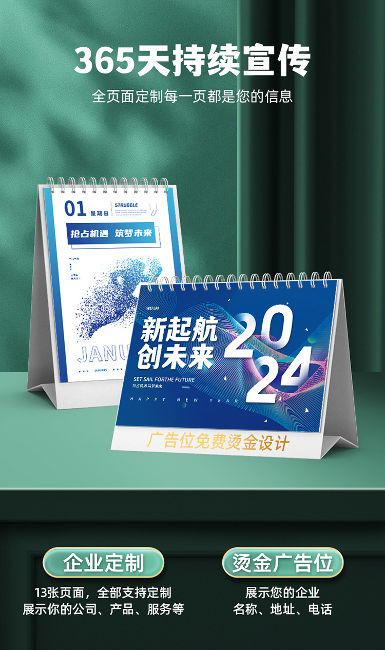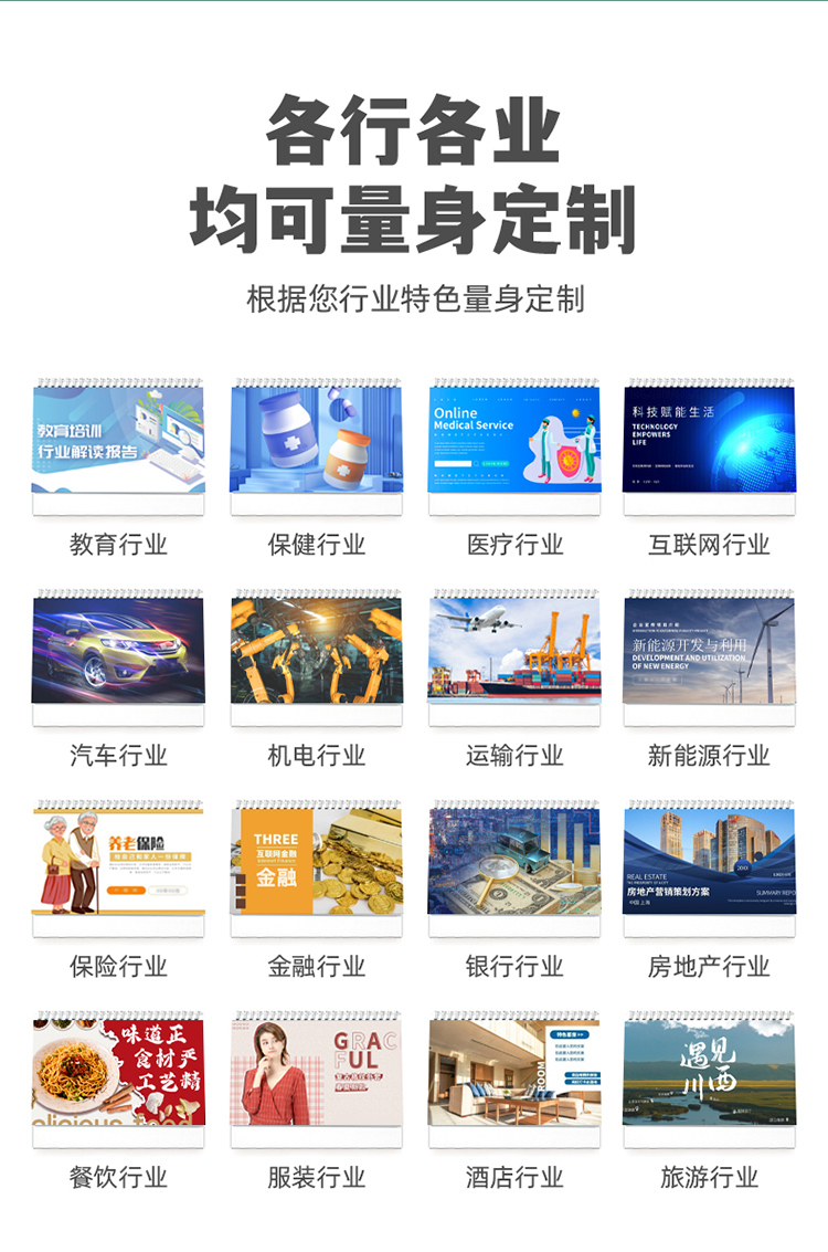 企业台历是指以宣传企业产品资料简介为内容的一种台历。通过印刷制作年度企业台历,并在旗下公司业务领域或客户关系维护过程中使用,搭建与客户的沟通桥梁,提升客户满意度,增强企业形象,通过台历中穿插不同主题的广告宣传,将企业信息最大化的向客户展示,通过客户在其办公室或生活场所放置企业台历,间接增加企业曝光率。