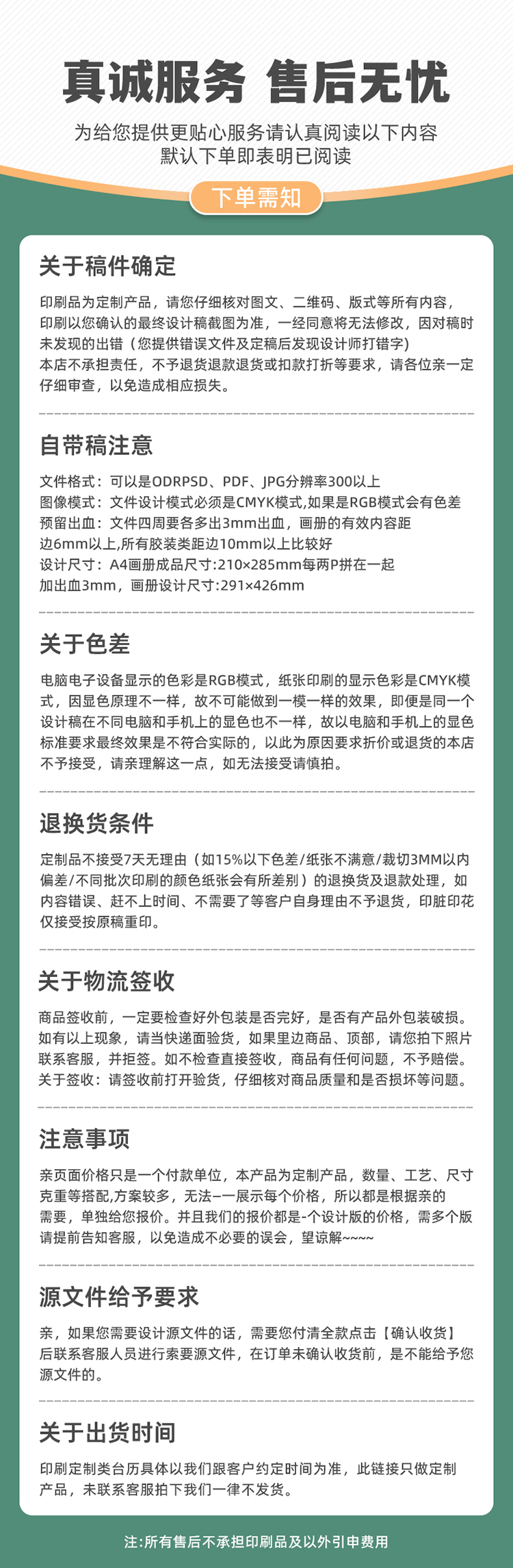 1、生产前我们会发您一份定稿文件,请您仔细审核无误后回复我们。对于未收到回复或因为反复校稿修改造成的延误,我们将不承担损失。