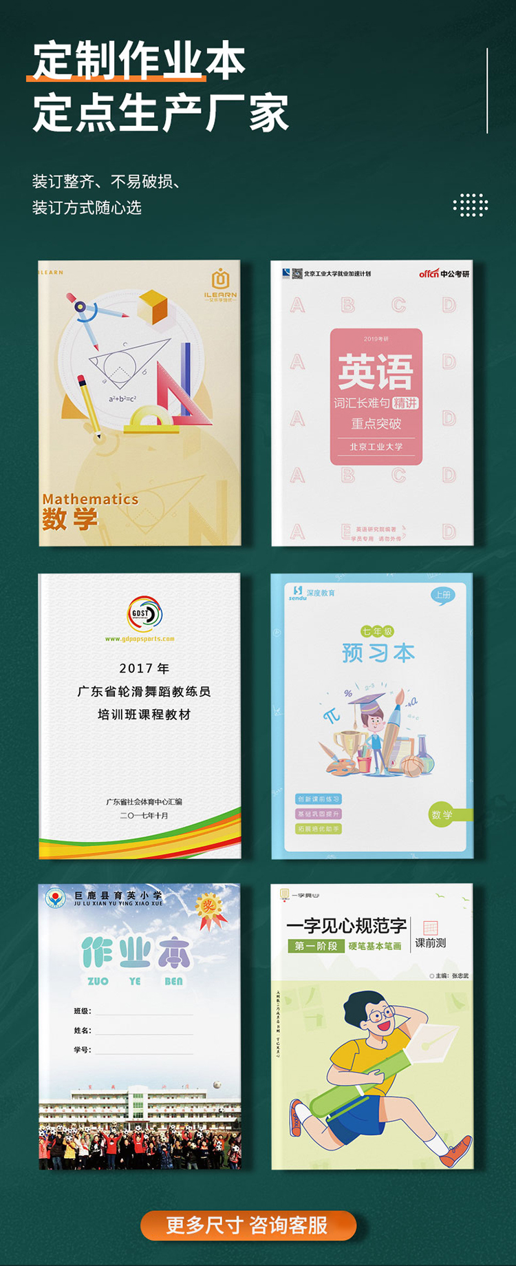 各类本子印刷定制,适用于错题本、数学本、英语本、横线本、数学本、田字本、拼音本、作文本、书法本、阅读记录本、培训广告本、企业记事本等本子定做。是学校、教育机构指定供应商,作业本源头工厂。一本定制广告作业本,实用性强,便携带,易保存,使用过程中容易被潜意识影响,还可定制logo,进一步加深品牌印象,一传十,十传百,性价比极高,投资回报高。